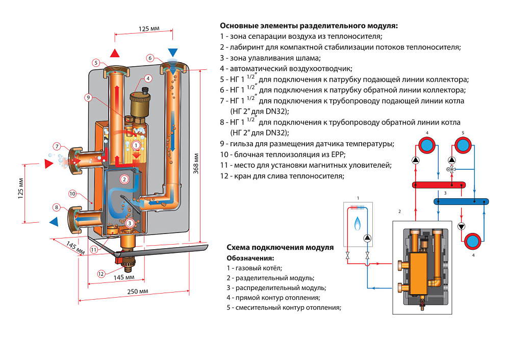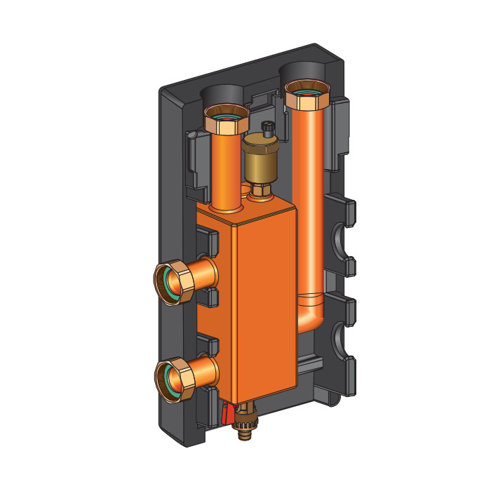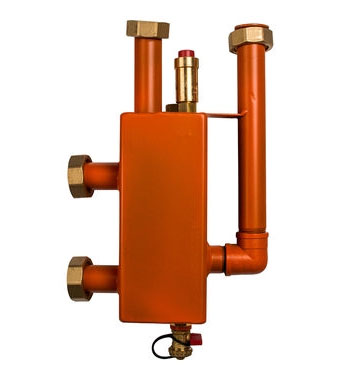 Дополнительными фукциями разделительного модуля является сепарация воздуха и удаление шлама из теплоносителя. Опционально возможна установка магнитных уловителей металлических частиц.
