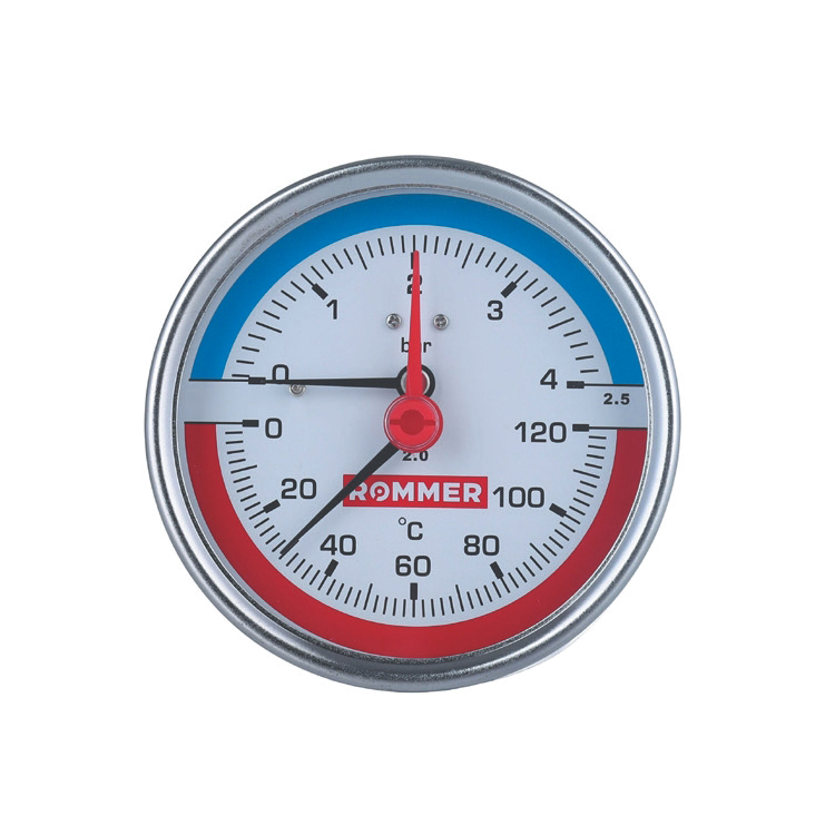 Стрелочные показывающие термоманометры с биметаллическим термочувствительным датчиком, аксиальные и радиальные ROMMER – предназначены для мониторинга давления и температуры сред в системах отопления, горячего и холодного водоснабжения, тепло- и холодоснабжения вентиляционных установок.