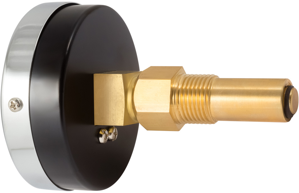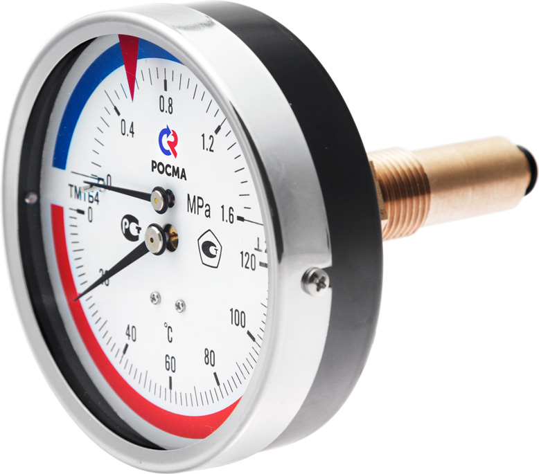 Прибор предназначен для одновременного измерения избыточного давления и температуры воды и других сред, неагрессивных к сплавам меди. Он представляет собой объединенные в одном корпусе деформационный манометр и биметаллический термометр. Для снятия показаний предусмотрены две шкалы – давления и температуры. Комплектуется клапаном, позволяющим демонтировать термоманометр без разгерметизации системы. Класс точности – 2,5. Диаметр корпуса – 100 мм. Диапазон измеряемых температур – от 0 до 150 °С, давления – от 0 до 10 бар. Присоединение – аксиальное. Диаметр присоединения – 1/2".