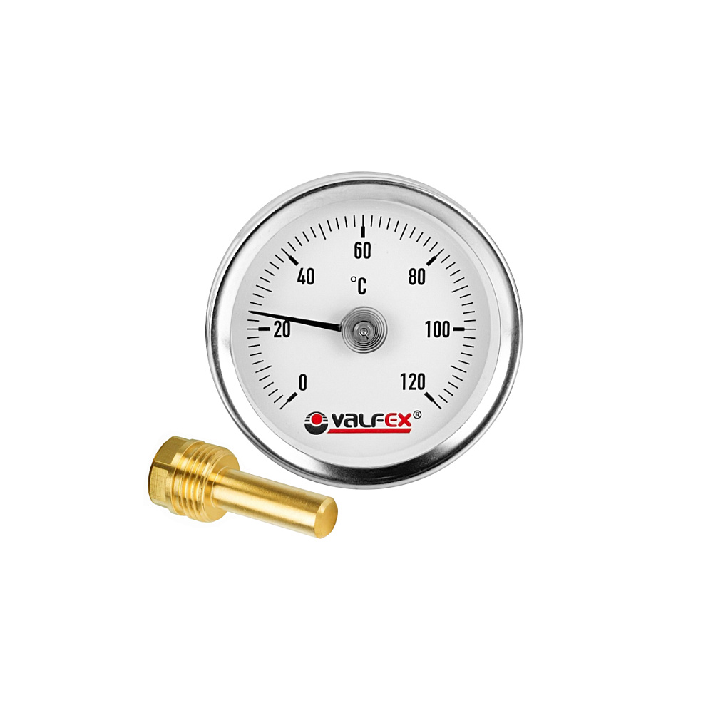 Термометр Valfex биметаллический термометр с погружной гильзой, 63 мм, 1/2, 120 гр.С
