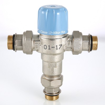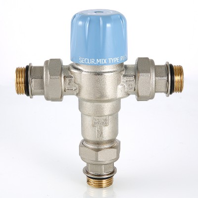 Трехходовой термостатический смесительный клапан VALTEC THERMOMIX с изменяемой в диапазоне от 30 до 50 oC настройкой. Предназначен для автоматического поддержания заданной температуры в системе горячего водоснабжения. Ее превышение исключается даже при полном отключении холодной воды, что позволяет использовать смеситель в школах, детских садах, других общественных зданиях. Термостат оперативно реагирует на изменение температуры и давления входящих потоков. Клапан выполнен из качественной латуни, никелирован. Встроенный термочувствительный элемент – жидкостного типа (наполнен толуолом). Патрубки клапана соединены накидными гайками с полусгонами. Резьба присоединений – внешняя. Входы смесителя комплектуются обратными клапанами из нейлона. Максимальная температура на входе горячей воды – 90 oC, допустимое рабочее давление входных потоков – до 10 бар.