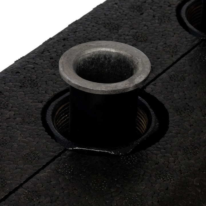 Распределительный коллектор STOUT представляют собой одну стальную коробчатую трубу прямоугольного сечения вместо обычно двух, к которой снизу и сверху соосно приварены парные патрубки (входные и выходные). Внутри трубы выполнены фигурные перегородки для разграничения прямого и обратного потоков теплоносителя и организации распределения его между всеми выходными патрубкам коллектора. Зигзагообразная форма перегородок позволила расположить патрубки вдоль одной оси коллектора.