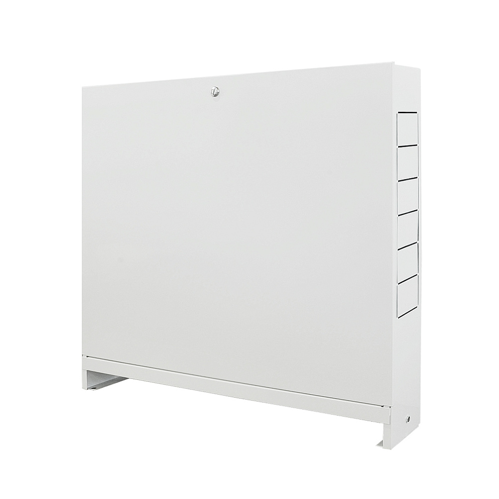Коллекторный шкаф ШРН стандартной глубины — применяется для монтажа и скрытия с глаз такого оборудования, как коллекторные группы, коллектора, запорная арматура, а так же другие компоненты по мере необходимости. Этот коллекторный шкаф является накладным на стену и изготовлен из стали толщиной 0.8 мм, покрытой порошковым напылением. Перед окраской на производстве осуществляется процесс фосфатирования. Стандартная глубина устройства (120 мм против 150 мм у глубокого шкафа) далеко не всегда позволяет размещать в нем смесительные узлы с насосами. Ящик имеет на передней двери защелку под отвертку для ее закрывания. Ключ не предусмотрен. В коробке для защиты при транспортировке поверхность оборудования покрыта пленкой. ОТКРЫВАЕТСЯ БЕЗ КЛЮЧА ЛЮБЫМ ПЛОСКИМ ПРЕДМЕТОМ!