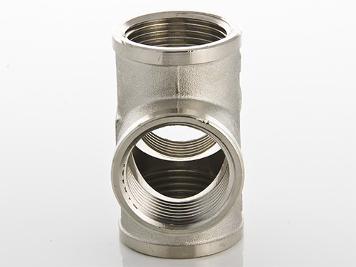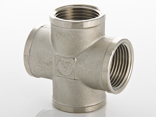 Латунный никелированный четырехсторонний фитинг, равнопроходной. Резьба – внутренняя, цилиндрическая трубная по ГОСТу 6357 (ISO 228, EN 10226), совместимая также с наружной конической трубной резьбой по ГОСТу 6211 (ISO R7).