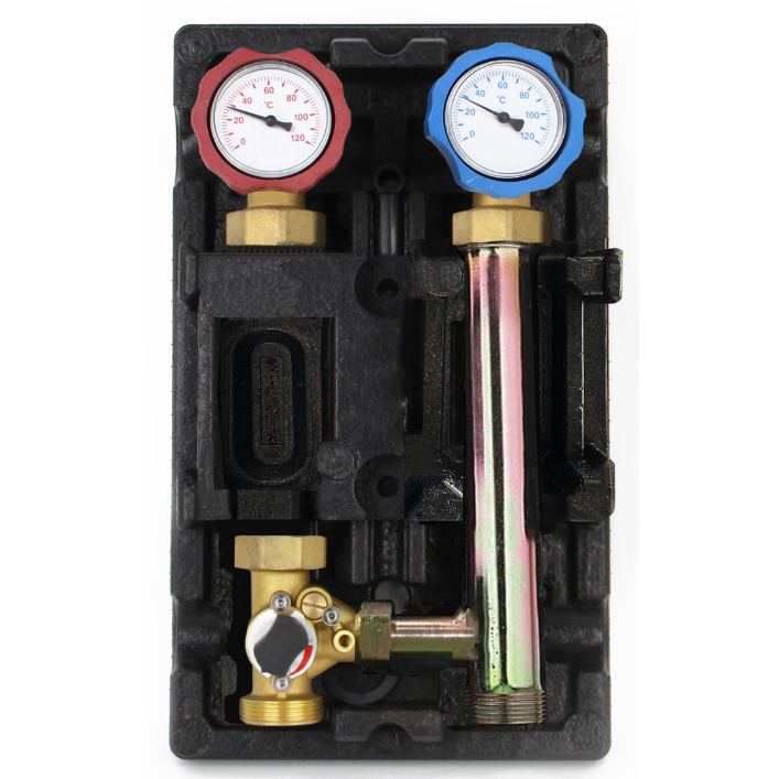 Насосная группа ROMMER RDG-1003-01250 без насоса с 3-ходовым приводным смесителем представляет собой набор элементов для обеспечения циркуляции и регулирования температуры теплоносителя в системе радиаторного отопления или "теплого пола".