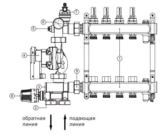 Регулирование температуры происходит путем подмеса жидкости из обратной линии. Регулирование происходит с помощью 2-ходового клапана, установленного в подающем коллекторе и управляемым термостатической головкой с выносным погружным датчиком, который размещен на выходе смесительного узла.