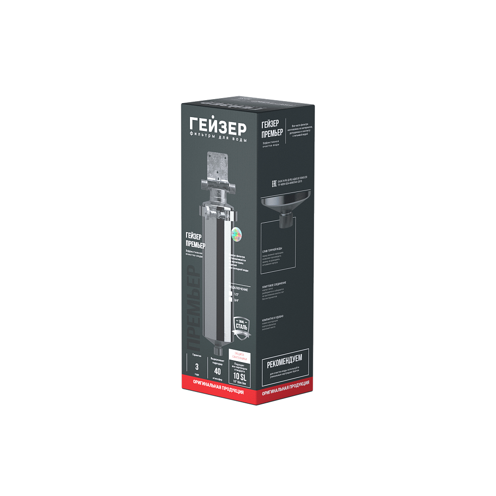 Гейзер-Премьер 10SL 1/2" устанавливается на вход в систему горячего или холодного водоснабжения. Корпус фильтра изготовлен из высококачественной нержавеющей стали марки 304L, устойчивой к возникновению коррозии, что гарантирует высокую надежность и многолетнюю работу фильтра.