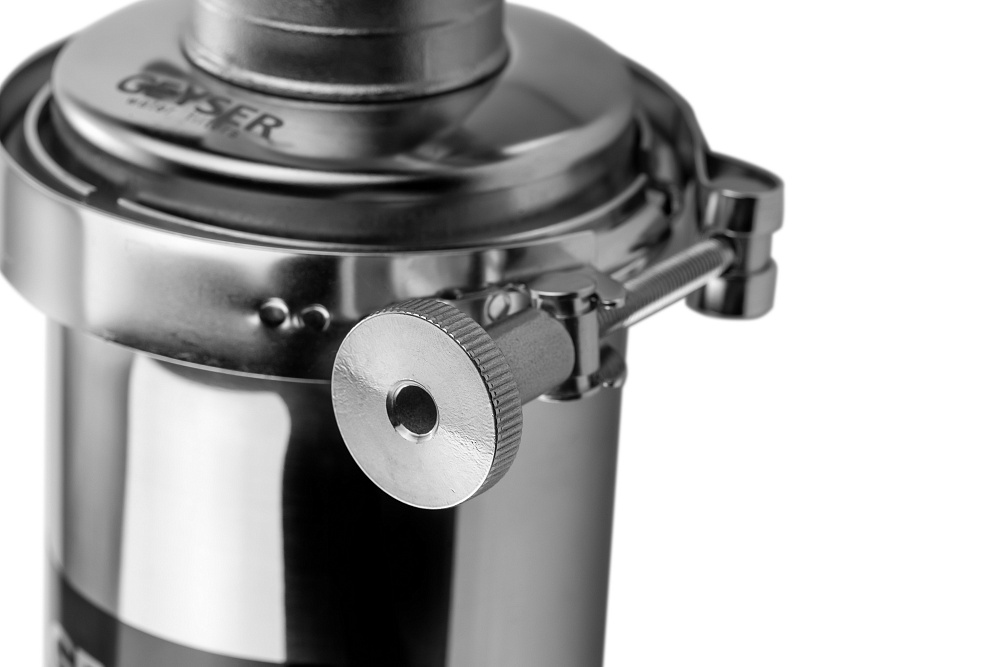 Гейзер-Премьер 10SL 1/2" легко подключается к магистрали и легко обслуживается. Хомутовое крепление крышки позволяет легко извлечь картридж без использования дополнительных ключей. Также для замены картриджа предусмотрено удобное отверстие для слива воды.