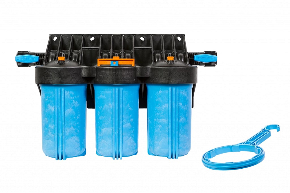 Корпус для картриджного фильтра предназначен для размещения в нём картриджей или фильтрующей засыпки для дальнейшей очистки холодной воды в бытовых условиях. Изготавливается из армлена, прочного материала устойчивого к циклическим нагрузкам и не пропускающего ультрафиолетовые лучи сквозь корпус. Типоразмер колб - Big Blue 10” Использование двухступенчатых корпусов фильтра рекомендуется в случаях, где необходимы картриджи разных фильтрующих свойств. Это существенно облегчит монтаж и последующее обслуживание системы по сравнению с одинарными корпусами. Поворот коллектора на 180° позволяет установить корпус фильтра в магистраль, с направлением движения воды, как слева направо, так и справа налево. Компактное расположение парных корпусов. Магистральную трубу можно разместить вплотную к стене. Кронштейн является одним целым с крышкой корпуса фильтра. В корпусе предусмотрены специальные технологические отверстия (пробки) для сброса избыточного давления и слива остаточной воды. В комплект поставки входит ключ, с помощью которого можно отвернуть колбу от крышки, а также уплотнительная вставка белого цвета для картриджных элементов без сердечника. На концах коллектора встроены шаровые краны.