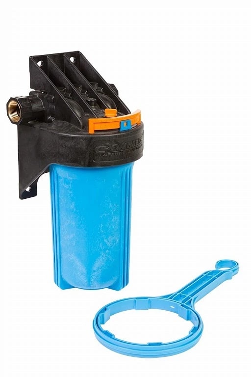 Корпус для картриджного фильтра предназначен для размещения в нём картриджей или фильтрующей засыпки для дальнейшей очистки холодной воды в бытовых условиях. Изготавливается из армлена, прочного материала устойчивого к циклическим нагрузкам и не пропускающего ультрафиолетовые лучи сквозь корпус. Типоразмер колбы - Big Blue 10”. Данная модель предназначена для установки на вертикальной трубопровод.