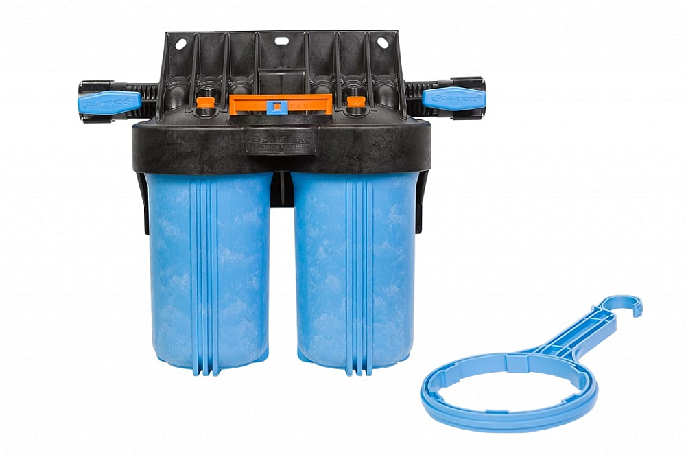 Корпус для картриджного фильтра предназначен для размещения в нём картриджей или фильтрующей засыпки для дальнейшей очистки холодной воды в бытовых условиях. Изготавливается из армлена, прочного материала устойчивого к циклическим нагрузкам и не пропускающего ультрафиолетовые лучи сквозь корпус. Типоразмер колб - Big Blue 10”. Использование двухступенчатых корпусов фильтра рекомендуется в случаях, где необходимы картриджи разных фильтрующих свойств. Это существенно облегчит монтаж и последующее обслуживание системы по сравнению с одинарными корпусами. Поворот коллектора на 180° позволяет установить корпус фильтра в магистраль, с направлением движения воды, как слева направо, так и справа налево. Компактное расположение парных корпусов. Магистральную трубу можно разместить вплотную к стене. Кронштейн является одним целым с крышкой корпуса фильтра. В корпусе предусмотрены специальные технологические отверстия (пробки) для сброса избыточного давления и слива остаточной воды. В комплект поставки входит ключ, с помощью которого можно отвернуть колбу от крышки, а также уплотнительная вставка белого цвета для картриджных элементов без сердечника. На концах коллектора встроены шаровые краны.