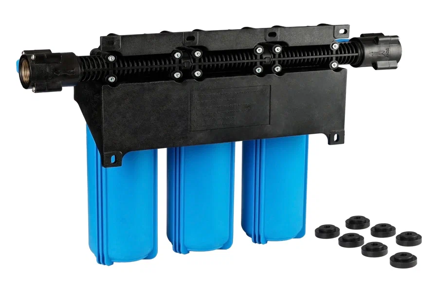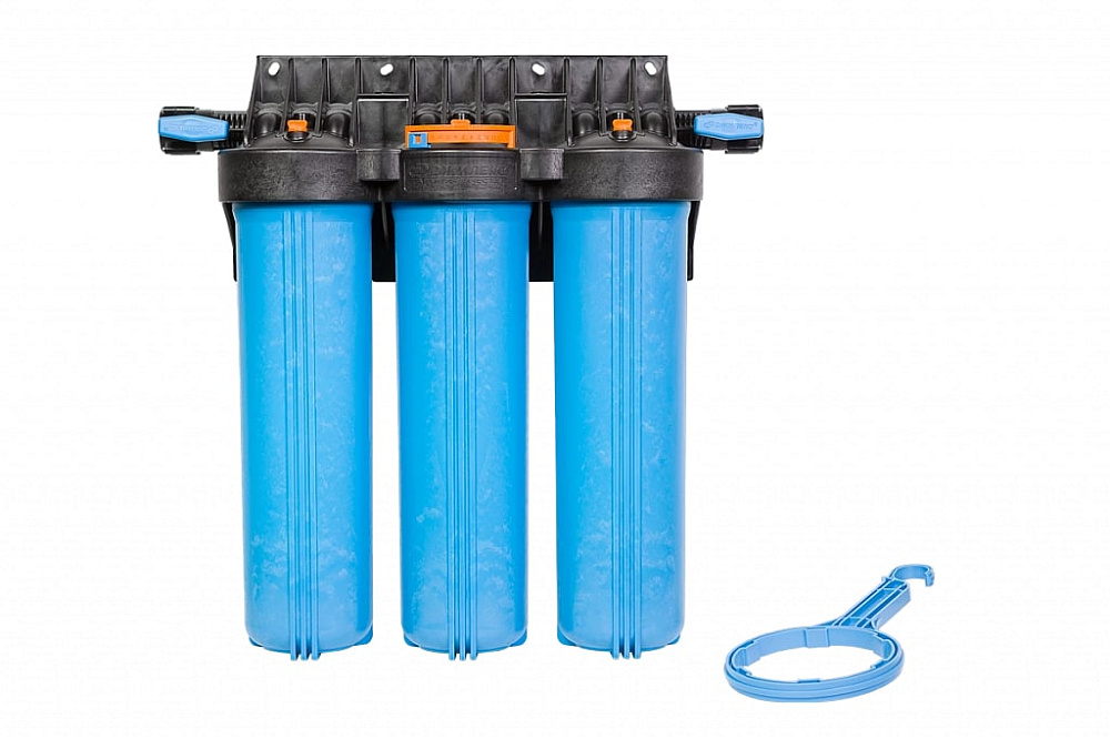 Корпус для картриджного фильтра предназначен для размещения в нём картриджей или фильтрующей засыпки для дальнейшей очистки холодной воды в бытовых условиях. Изготавливается из армлена, прочного материала устойчивого к циклическим нагрузкам и не пропускающего ультрафиолетовые лучи сквозь корпус. Типоразмер колб - Big Blue 20”. Использование трехступенчатых корпусов фильтра рекомендуется в случаях, где необходимы картриджи разных фильтрующих свойств. Это существенно облегчит монтаж и последующее обслуживание системы по сравнению с одинарными корпусами. Поворот коллектора на 180° позволяет установить корпус фильтра в магистраль, с направлением движения воды, как слева направо, так и справа налево. Компактное расположение парных корпусов. Магистральную трубу можно разместить вплотную к стене. Кронштейн является одним целым с крышкой корпуса фильтра. В корпусе предусмотрены специальные технологические отверстия (пробки) для сброса избыточного давления и слива остаточной воды. В комплект поставки входит ключ, с помощью которого можно отвернуть колбу от крышки, а также уплотнительная вставка белого цвета для картриджных элементов без сердечника. На концах коллектора встроены шаровые краны.