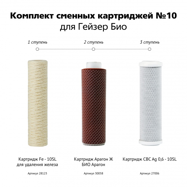 Комплект№ 10 Сменных картриджей Гейзер предназначен для замены исчерпавших свой ресурс картриджей трёхступенчатых фильтров компании «Гейзер»: Гейзер-3ИЖ люкс, Гейзер-3 ИВЖ люкс, Гейзер- 3 ИЖ, Гейзер- 3 ИЖ Элита, Гейзер- 3 ВИЖ Элита стандарта 10 SL. Применяются для доочистки жёсткой воды.