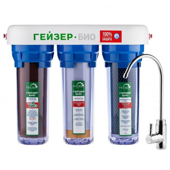 Стационарная фильтрационная система Гейзер БИО 332 – отличное решение умягчения, очищения и минерализации сильно жесткой воды. Она имеет государственную сертификацию по системе ГОСТ Р и по надзору в сфере защиты прав потребителей. Этот бытовой фильтр прекрасно подходит для очистки московской водопроводной воды от всех классов загрязнения.