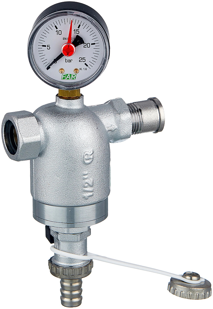 Фильтр для воды FAR 1/2 НР-BР, с манометром, 300мкм, Max: 95 C, 25 бар