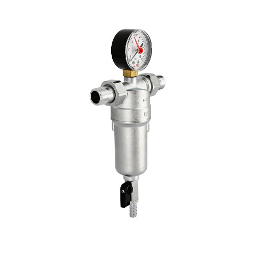 Фильтр промывной UNI-FITT ВН 1/2 х 3/4 с редукционным соединением,со сливным шаровым краном и манометром, хромированный