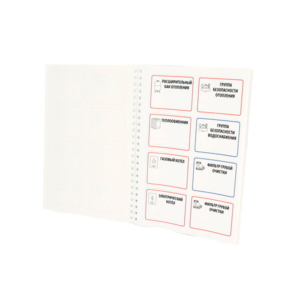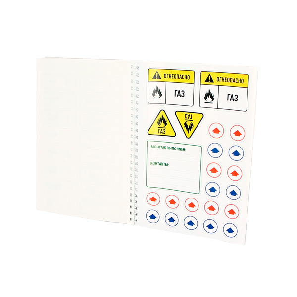 Предназначены для маркировочного бейджа. Книжка содержит 64 основных наклейки (60 ? 45 мм), которые клеются на табличку для маркировки труб артикул 869S6344, 54 наклейки-вставки (23 ? 7 мм) и 81 дополнительная наклейка.
