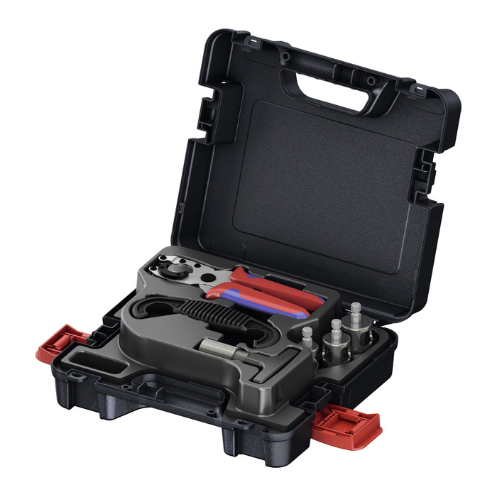 Комплект инструментов содержит ножницы для резки труб, насадки для калибровки и снятия фаски, рукоятку и комплект ключей для разборки соединений