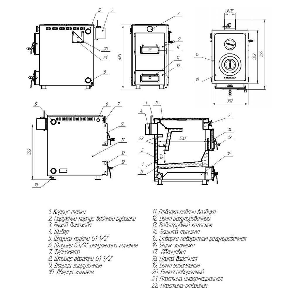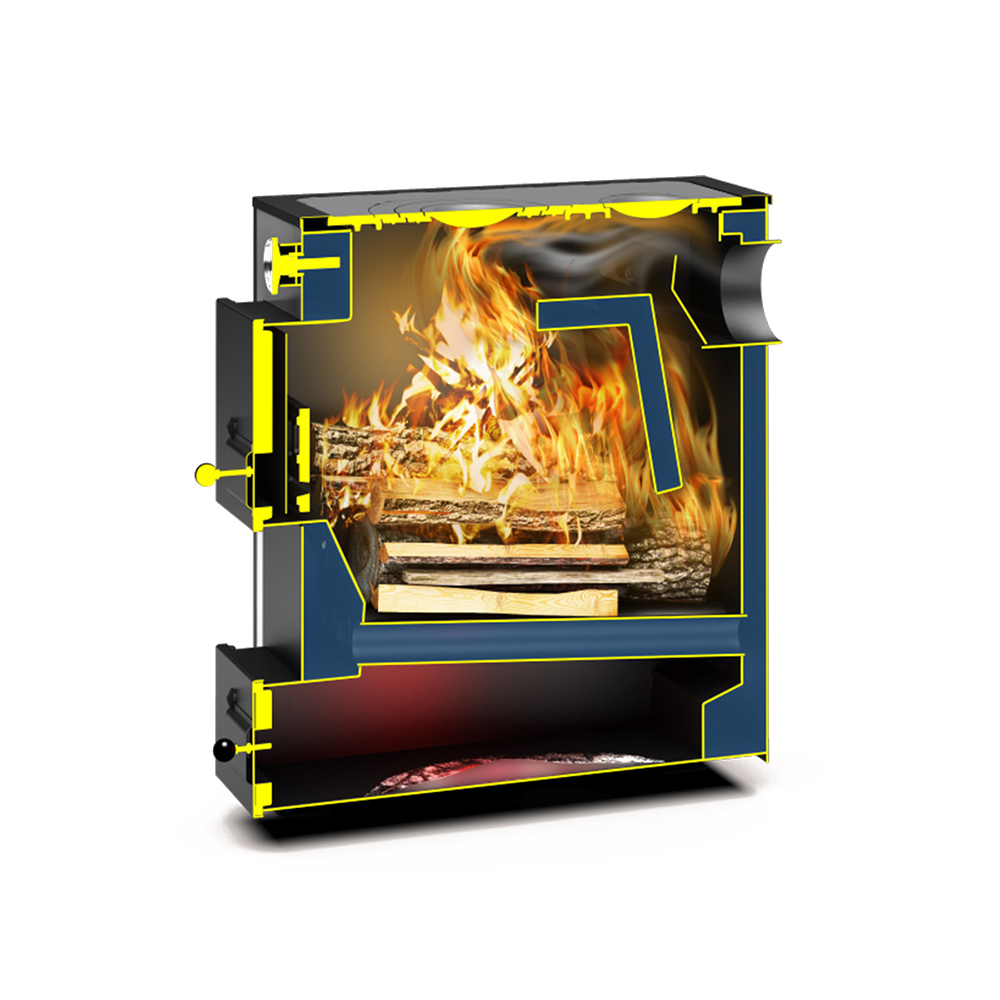 В качестве топлива используется твёрдое топливо (дрова, уголь, брикеты). На котёл может быть установлен блок из трёх ТЭНов суммарной мощностью 6 кВт. Глубокая наклонная топка для использования длинных дров и равномерного распределения угля по всей глубине топки при засыпке.