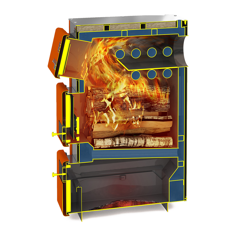 Время горения на одной закладке угля - до 12 часов. Такая длительность достигнута благодаря системе подачи вторичного воздуха в камеру сгорания и водотрубной колосниковой решетке, которая снимает тепло даже с тлеющих углей.