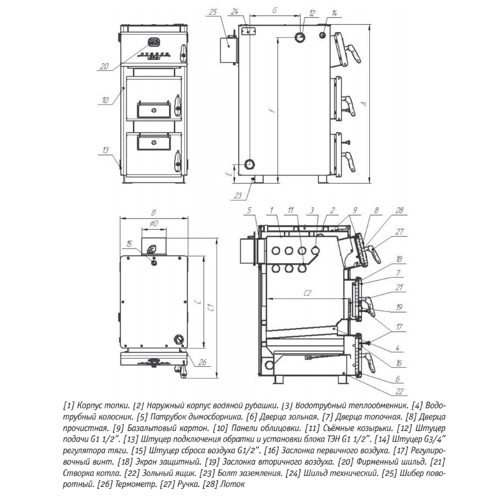• Возможность установки горелки пеллетные горелки АПГ-25, ГПФ 26 Комфорт, ГПФ 26 Норма; газовые горелки АГГ-26К, АГГН-26К, АГГ-26КБ, АГГН-26КБ