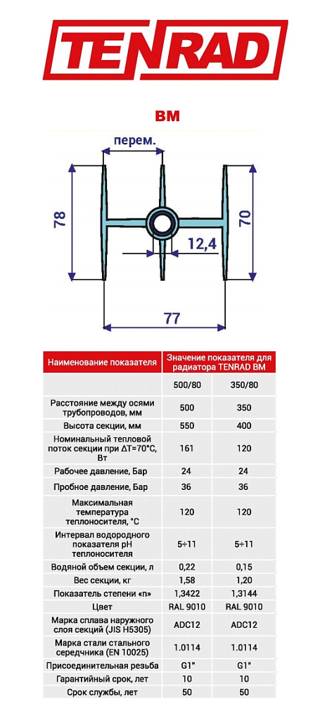 TENRAD BM – полнобиметаллические радиаторы отопления, конструкция которых исключает контакт металла оболочки с теплоносителем.