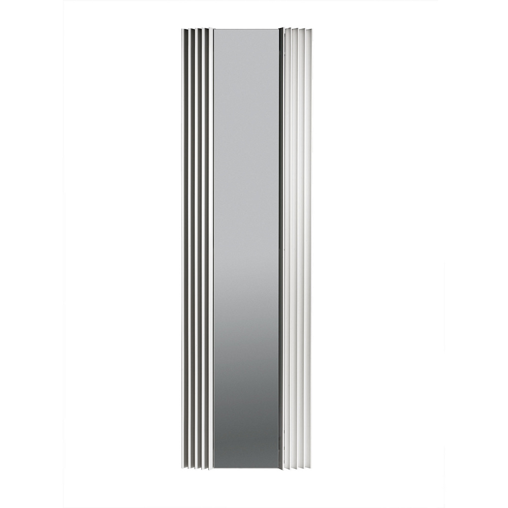 Радиатор Iguana Visio состоит из вертикальных стальных трубок треугольного сечения, наваренных на стальные направляющие кронштейны. Гидравлическое подключение между обогревающими трубками осуществляется посредством изогнутых стальных патрубков, последовательно закрепленных на изогнутой поверхности; в промежутке между рядами трубок располагается зеркало такой же длины, что и кожух радиатора. Зеркало имеет обрезную кромку по всему периметру и габариты 26 см х 179 см. В комплект поставки входят стенные кронштейны и 2 клапана для выпуска воздуха G 1/8″. Центральное подключение; стандартным является подключение к 2-трубной системе (межосевое расстояние 50 мм). Подходит для центрального отопления.