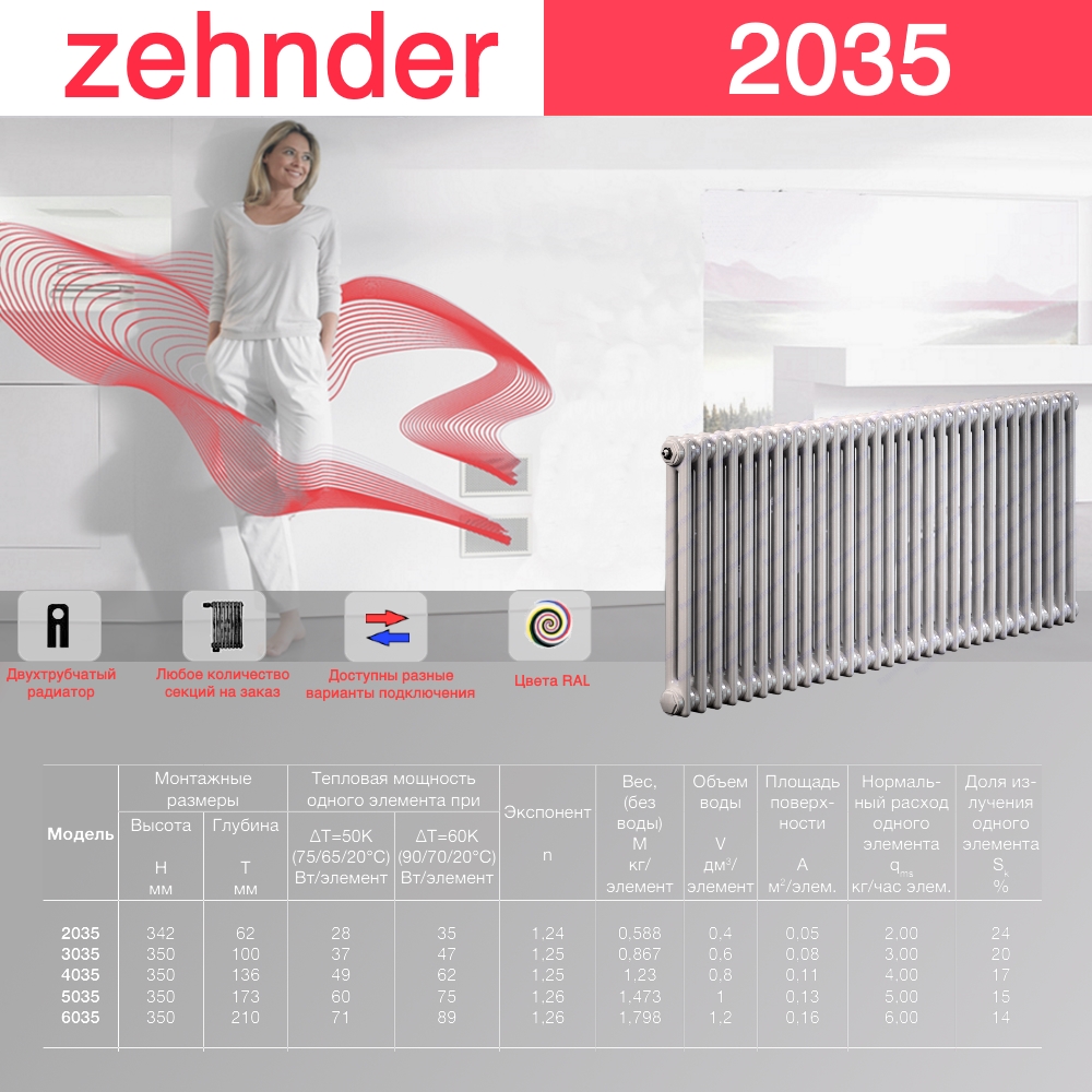 Zehnder Charleston 2035 - трубчатый стальной радиатор с 2 трубками в каждой секции.