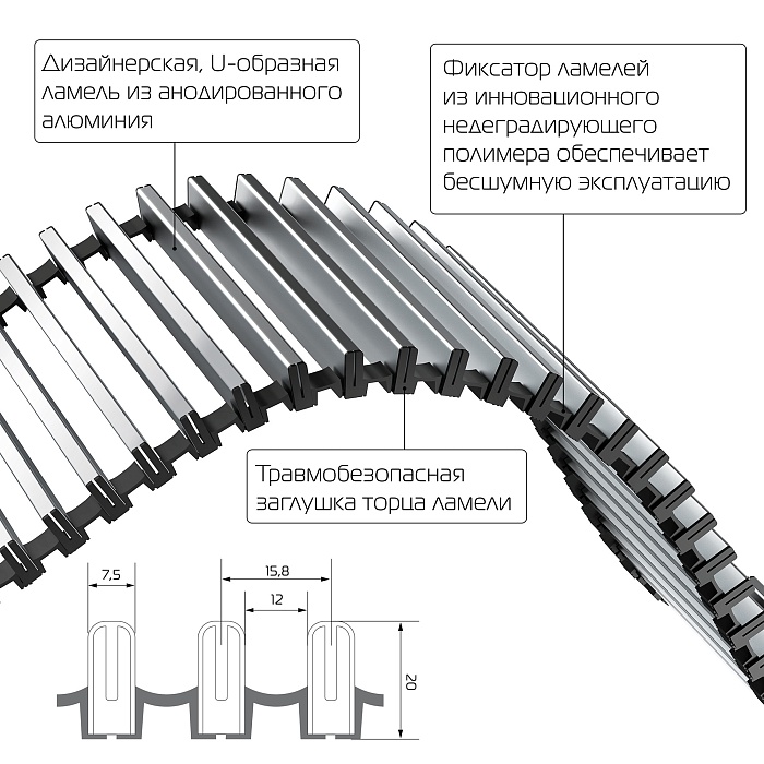 Фиксаторы ламелей решётки сделаны из инновационного недеградирующего полимера: такой пластик долговечен и не подвержен разрушению от воздействия ультрафиолета и перепадов температур. Высокоэластичные фиксаторы позволяют легко и компактно свернуть решётку, поэтому её удобно мыть даже в посудомоечной машине. А благодаря увеличенной высоте ламелей дизайнерская решётка выдерживает шаговую нагрузку более 250 кг. Решетка полностью ремонтопригодная: любую отдельную ламель можно вытащить из фиксаторов и заменить на новую, а анодирование алюминия обеспечивает долгий срок эксплуатации. Торцевые протекторы ламелей решётки защищают от травм, поэтому решётка полностью безопасна для детей и домашних питомцев.
