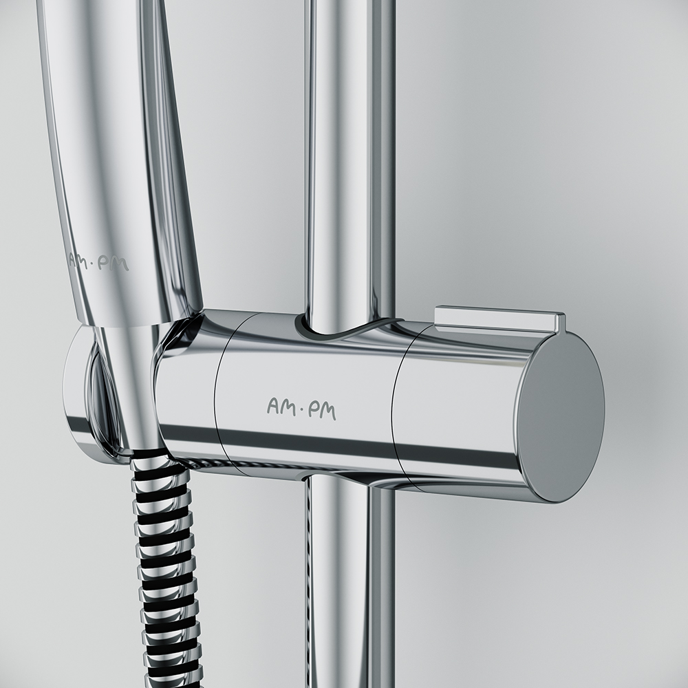 Продуманные детали для удобства использования: шарнирное соединение защищает душевой шланг от перекручивания, регулируемый в трех плоскостях держатель ручного душа, функция Rub&Clean для легкой очистки душевых форсунок.