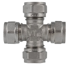 (VTm.341.N) Латунный никелированный фитинг для соединения четырех металлополимерных труб (крестовина). Имеются равнопроходные модели и модели с разными диаметрами «пересекающихся» трубопроводов.