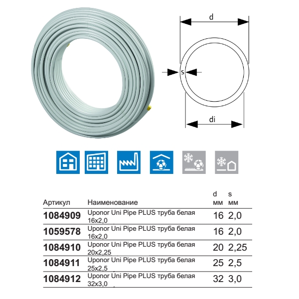Uponor Uni Pipe PLUS труба белая в бухтах Кислородонепроницаемая многослойная композиционная труба (Полиэтилен повышенной термостойкости PE-RT II - Клей - Бесшовный алюминий - Клей - Полиэтилен повышенной термостойкости PE-RT II), произведённая по технологии SACP, для водоснабжения, радиаторного и напольного отопления, охлаждения.