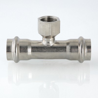Пресс-тройник из нержавеющей стали с внутренней резьбой предназначен для соединения тонкостенных стальных труб с резьбовым элементом системы водоснабжения, отопления, других инженерных и технологических установок. Фитинг рассчитан на эксплуатацию при максимальной рабочей температуре 95 oС. Номинальное давление – 16 бар.