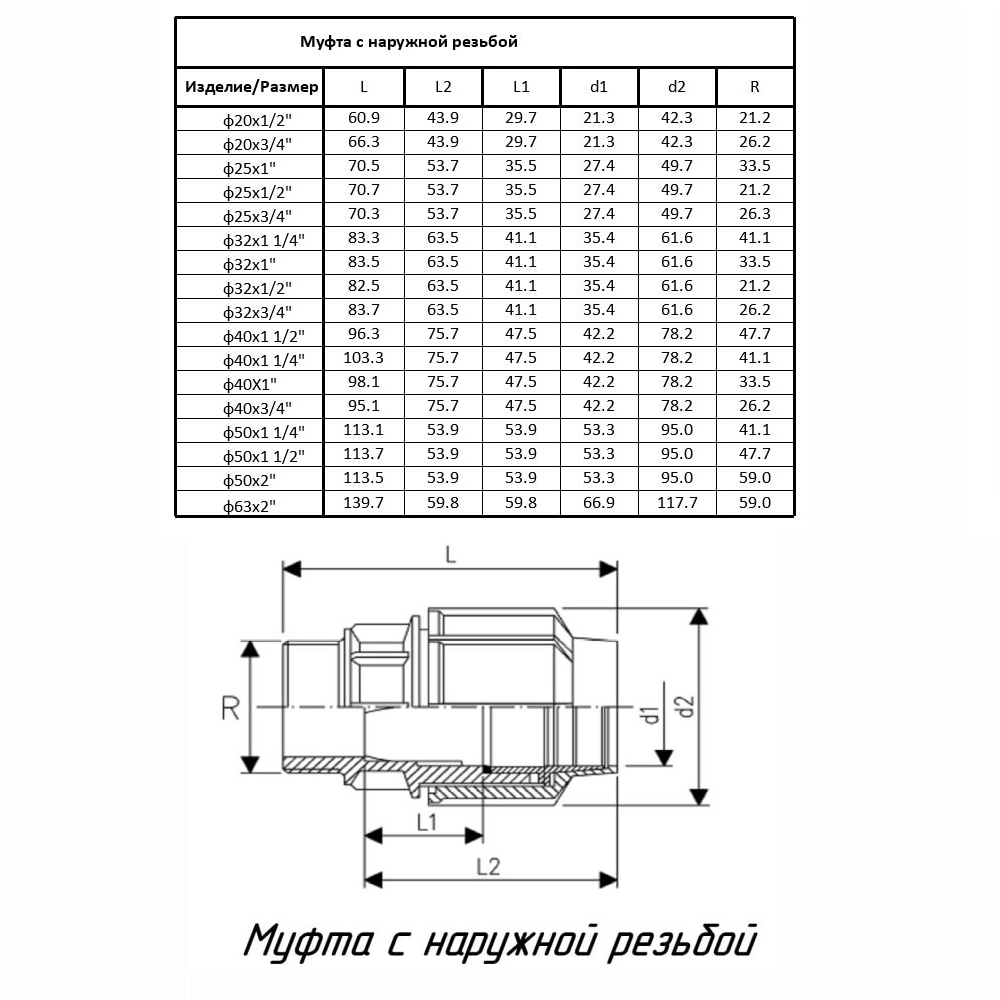 Муфта компрессионная с наружной трубной резьбой. Предназначена, для возможности легкого перехода со стального трубопровода на трубопровод из ПНД труб, так как имеет резьбу соответствующую размерам и стандартам стальных трубных резьб. Кроме этого муфта компрессионная с наружной резьбой может учувствовать в строительстве различных комбинаций отводов и разветвлений с применением других компрессионных ПНД фитингов.