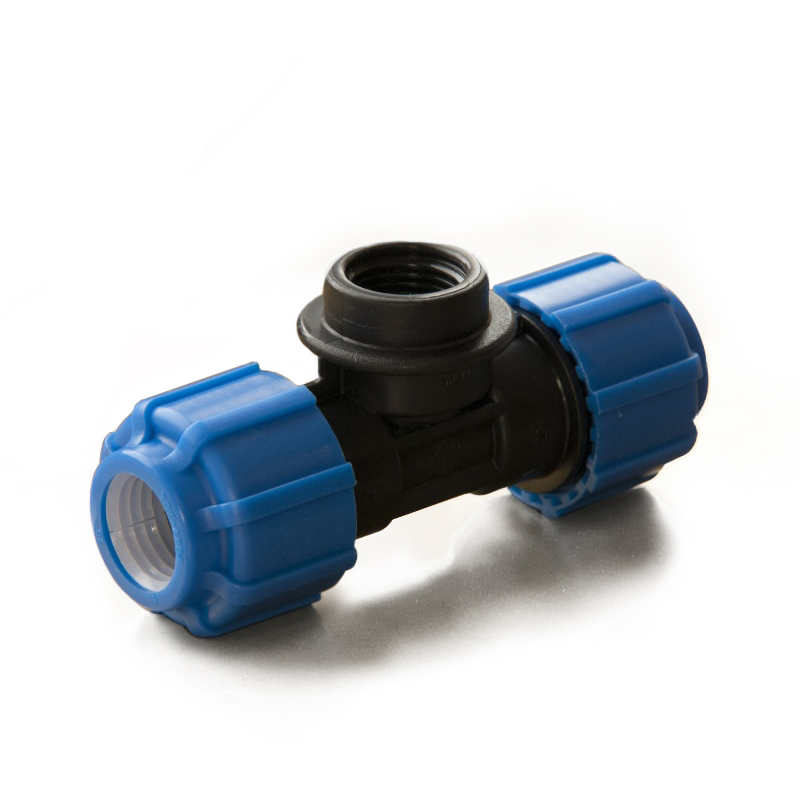 Тройник компрессионный с внутренней трубной резьбой является универсальной деталью полиэтиленового трубопровода имеющий внутреннюю резьбу с шагом, соответствующим стандартным размерам стальных труб, благодаря чему, этот тройник можно использовать для перехода с ПНД трубы на стальную и наоборот.