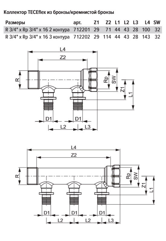 Коллектор 3/4, одна сторона с внутренней резьбой Rp 3/4, другая - с наружной резьбой R 3/4. Вывод TECEflex размер 16 (заглушки 3/4 не входят в комплект).