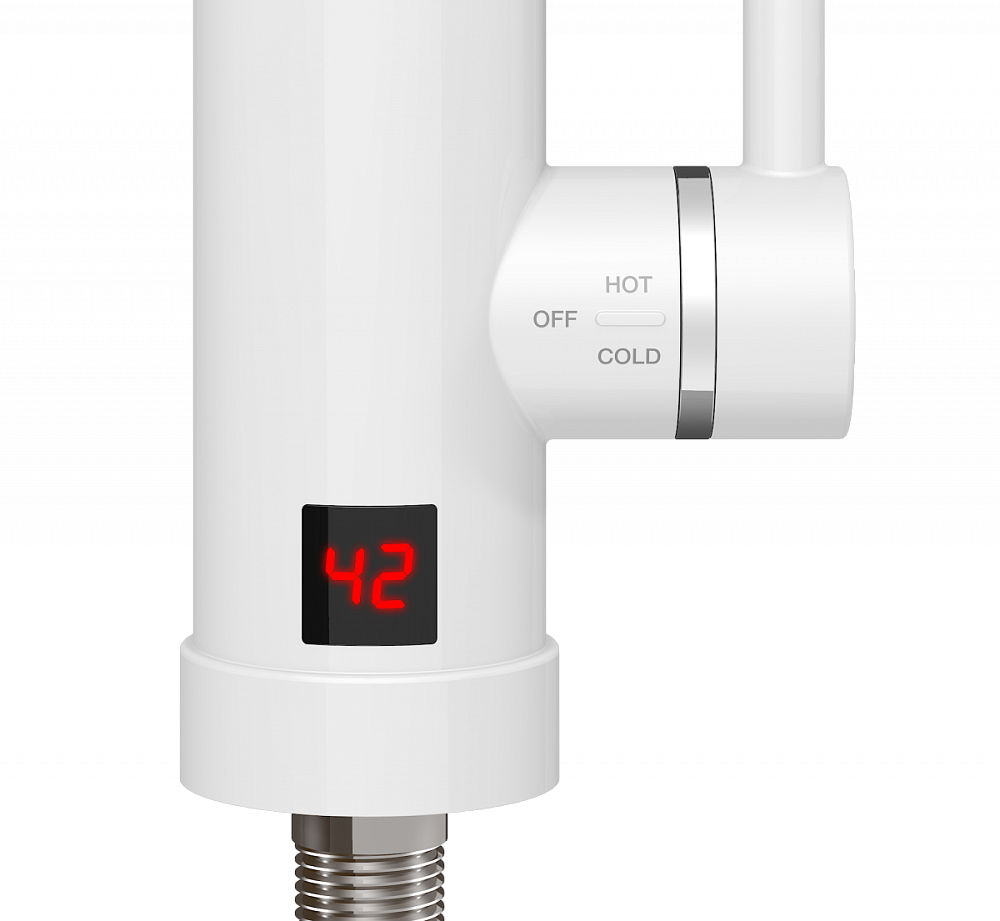 Простое управление: температура воды и напор настраиваются одним механическим регулятором, как у обычного смесителя. На корпусе расположен дисплей, на котором отображается температура воды;